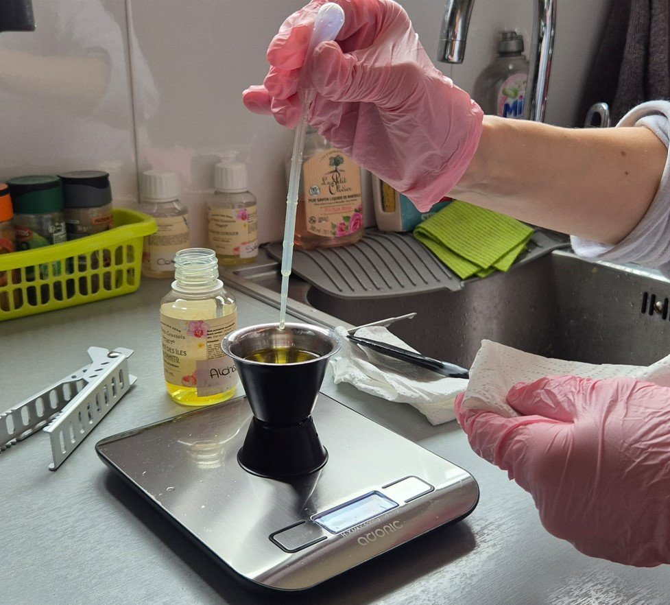 Dans ma cuisine, je commence par mesurer les cires et les parfums avec précision. Cela garantit que chaque bougie possède un équilibre parfait entre esthétique et parfum.