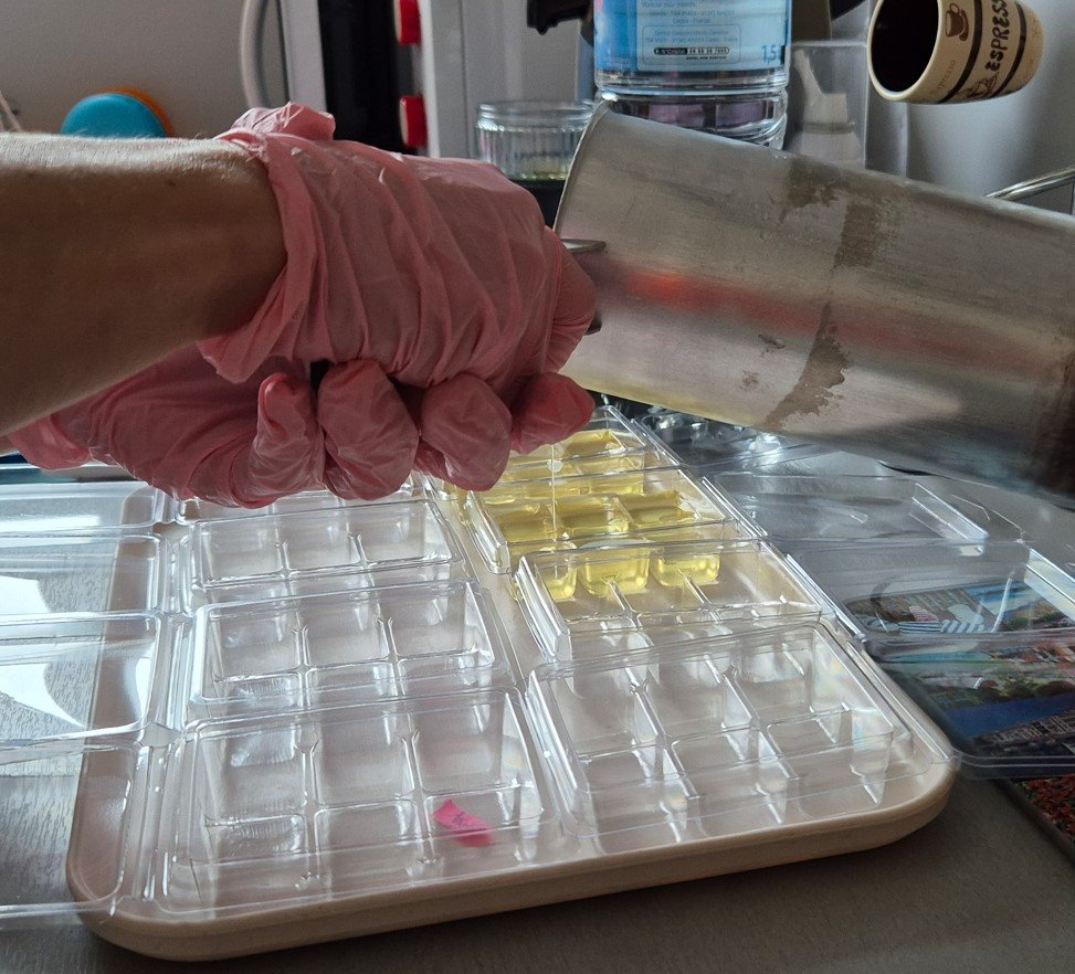 La cire parfumée est versée dans des moules ou des contenants soigneusement sélectionnés. J'attends patiemment que chaque pièce prenne forme et se solidifie.